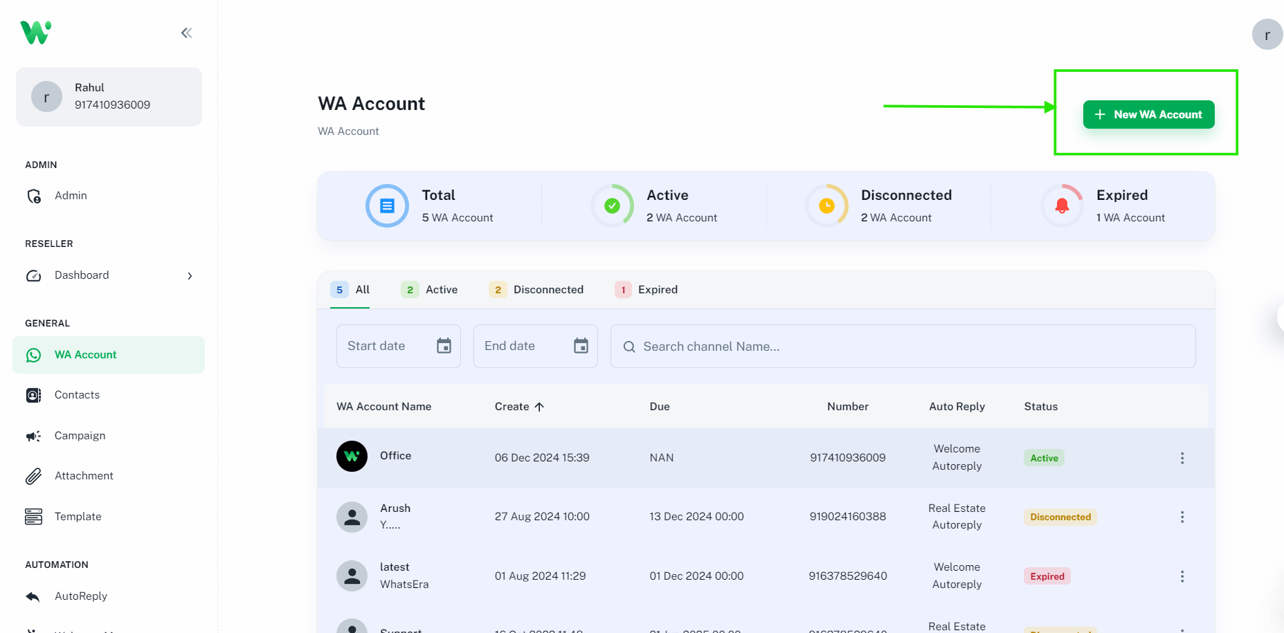 Navigate to the WA Account option in the WhatsEra dashboard.